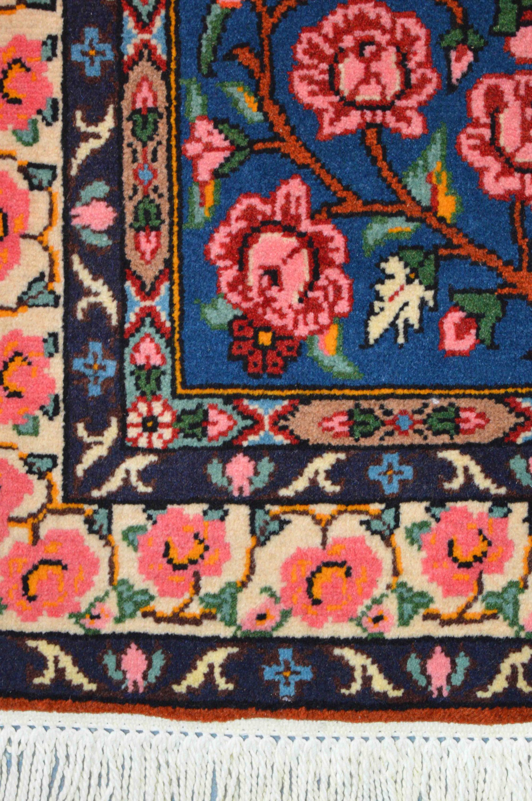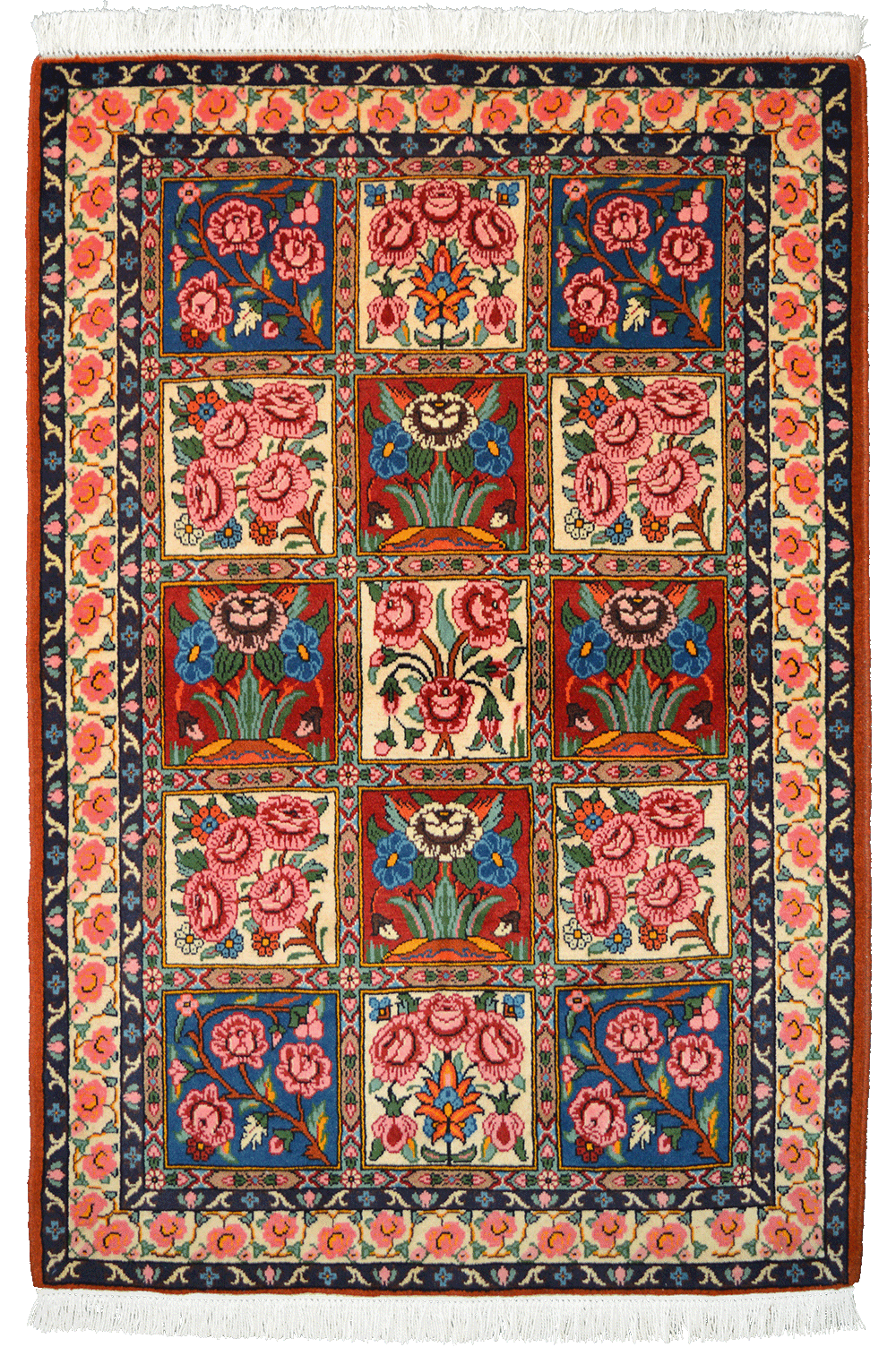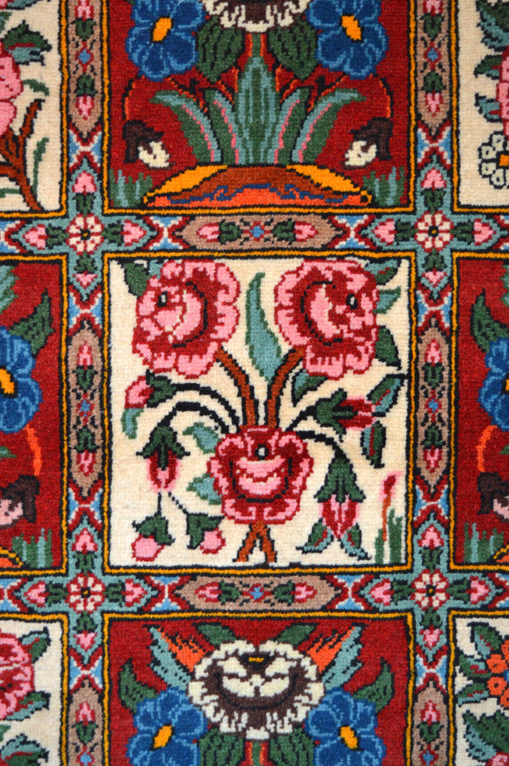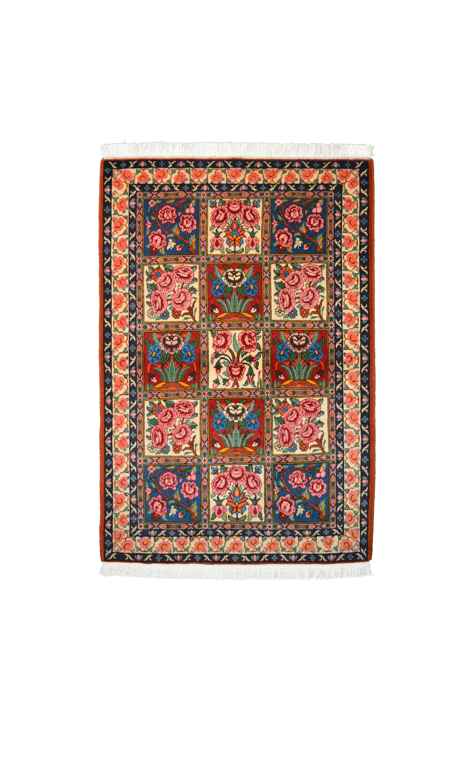 BAKTHIARI small con motivo a formelle annodato interamente a mano. I BAKTHIARI prendono il nome dalla tribù nomade d’origine. Caratterizzati da motivi a cavallo tra il floreale e il geometrico, presentano un robusto vello in lana e cromie naturali unite ad elementi vivaci.