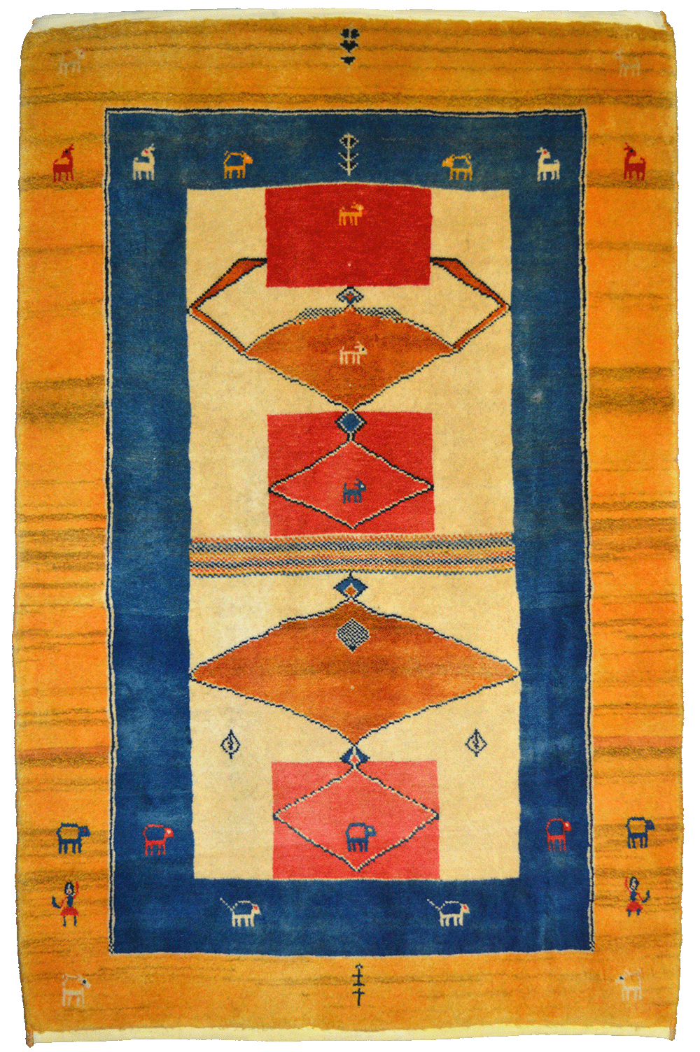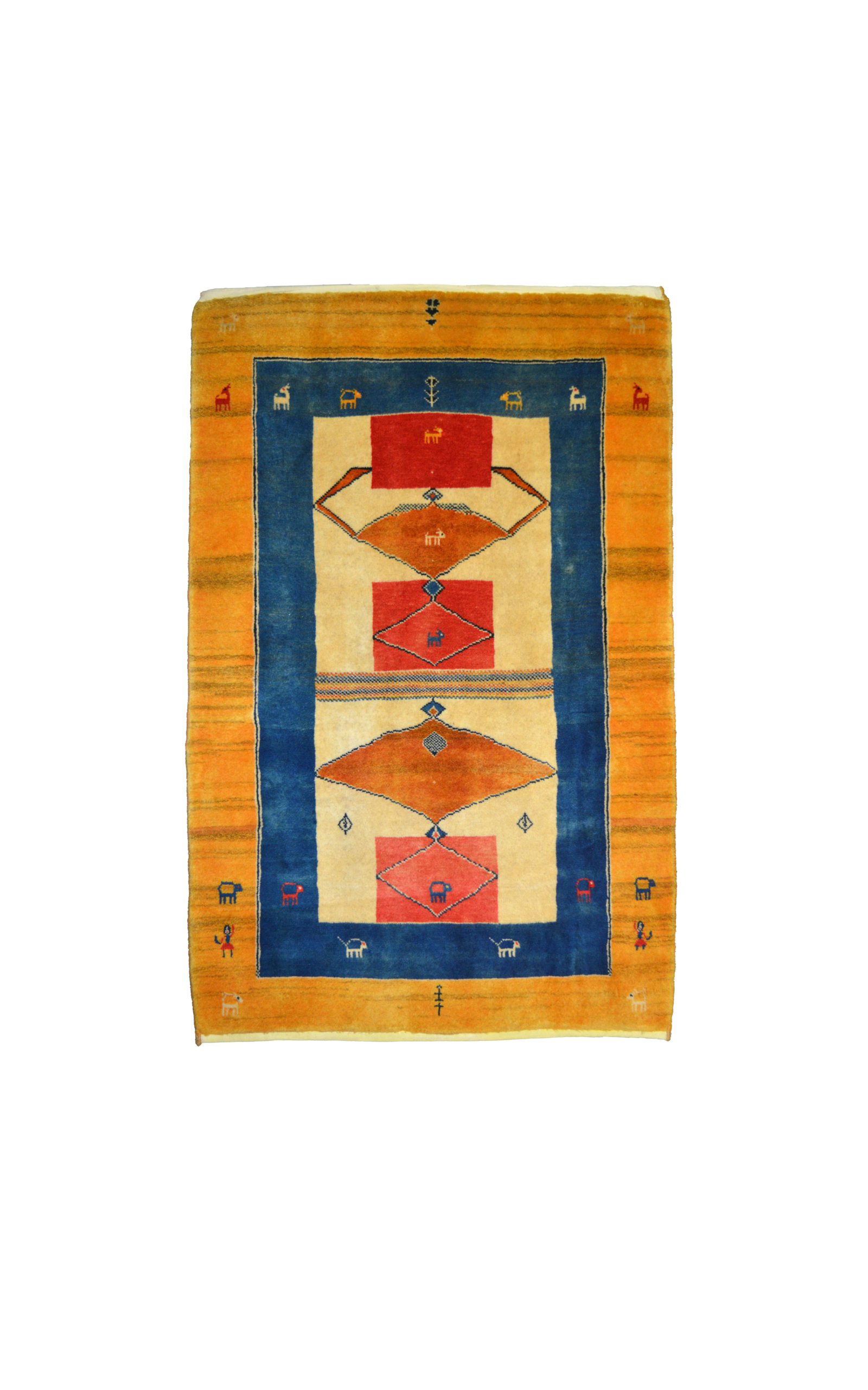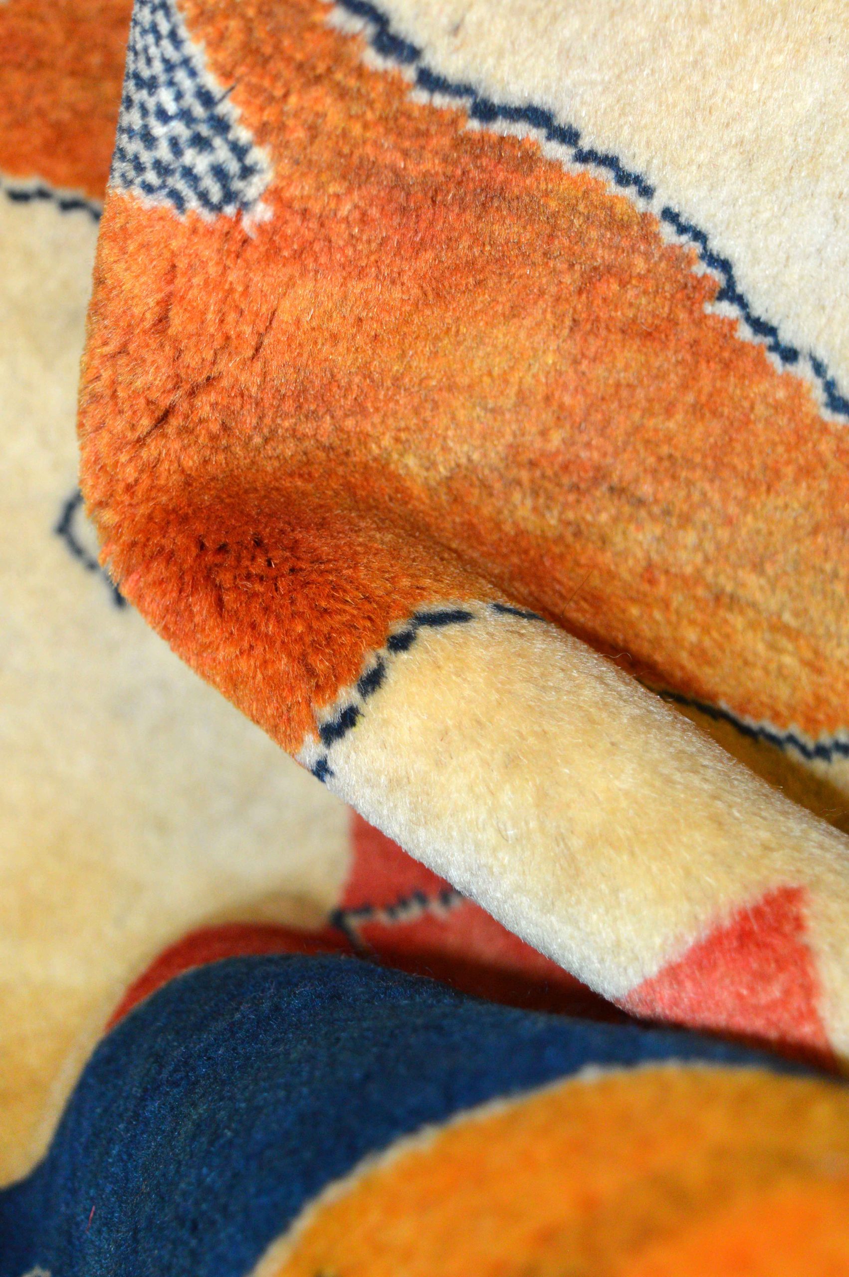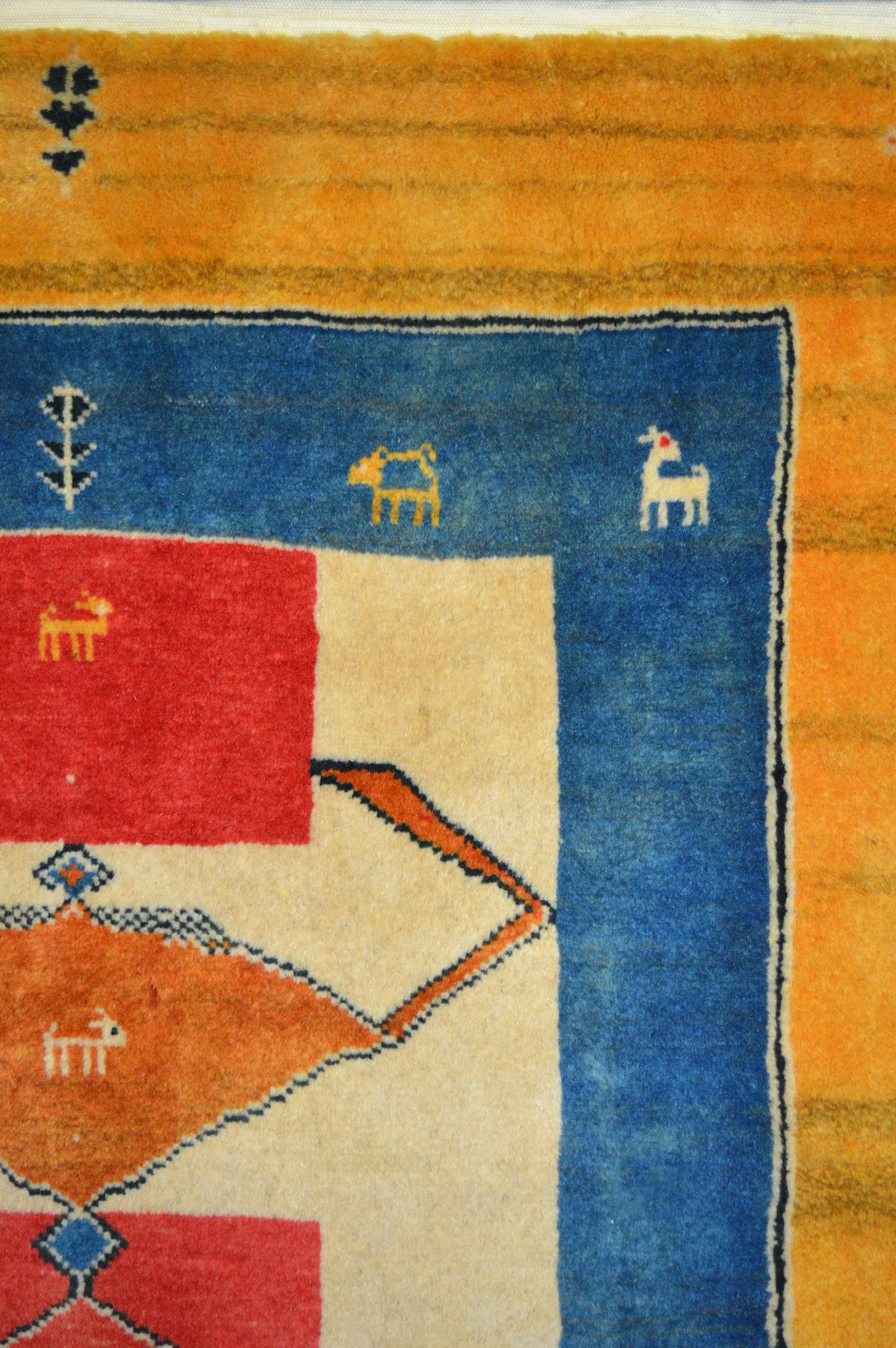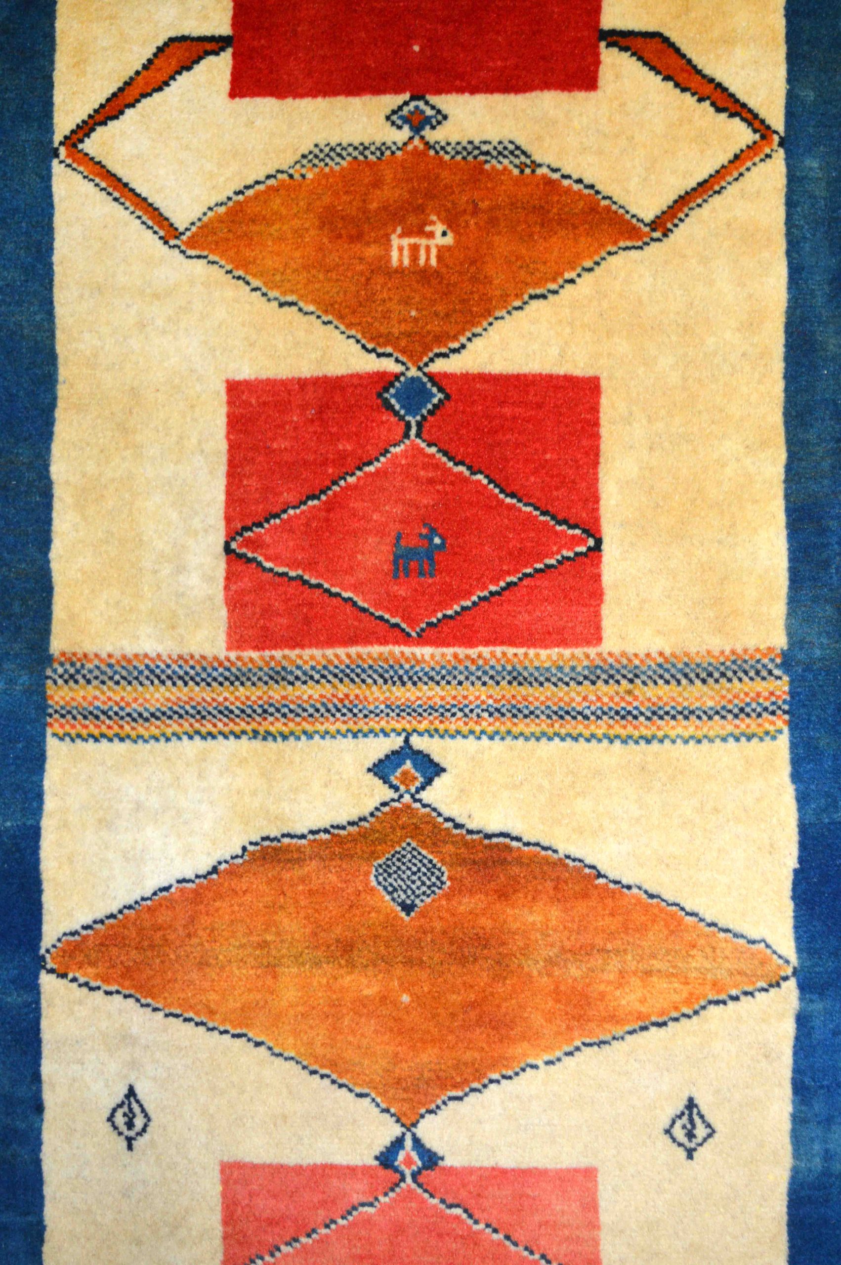 Delizioso tappeto GABBEH di piccole dimensioni. I GABBEH sono tappeti annodati interamente a mano, di origine nomade, caratterizzati da un confortevole vello in lana declinato in campiture monocromatiche, impreziosite da dettagli geometrici e piccoli disegni stilizzati. Fanno da ponte tra tradizione e design contemporaneo in virtù della loro estetica minimal ma audace.